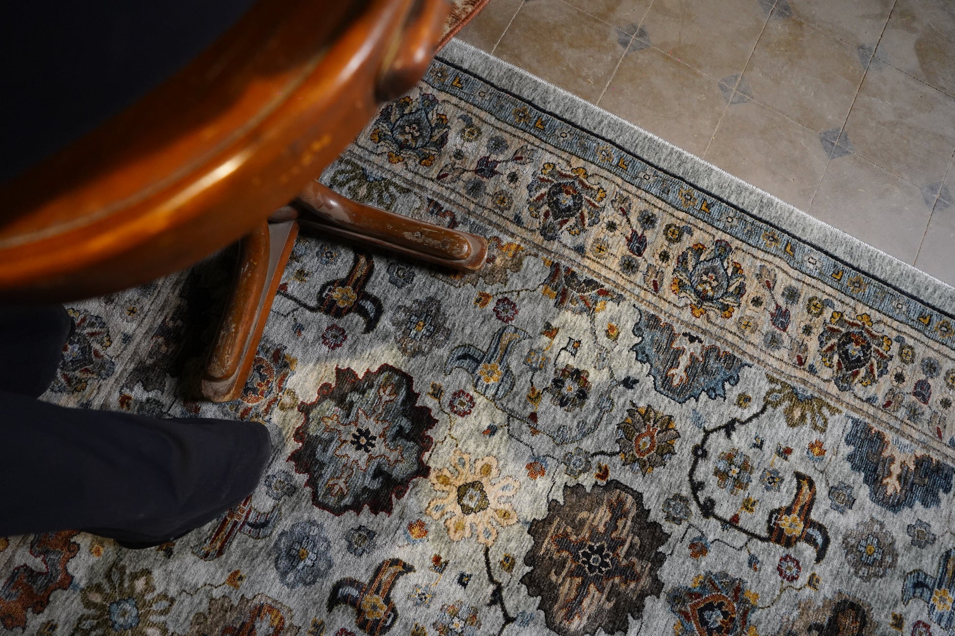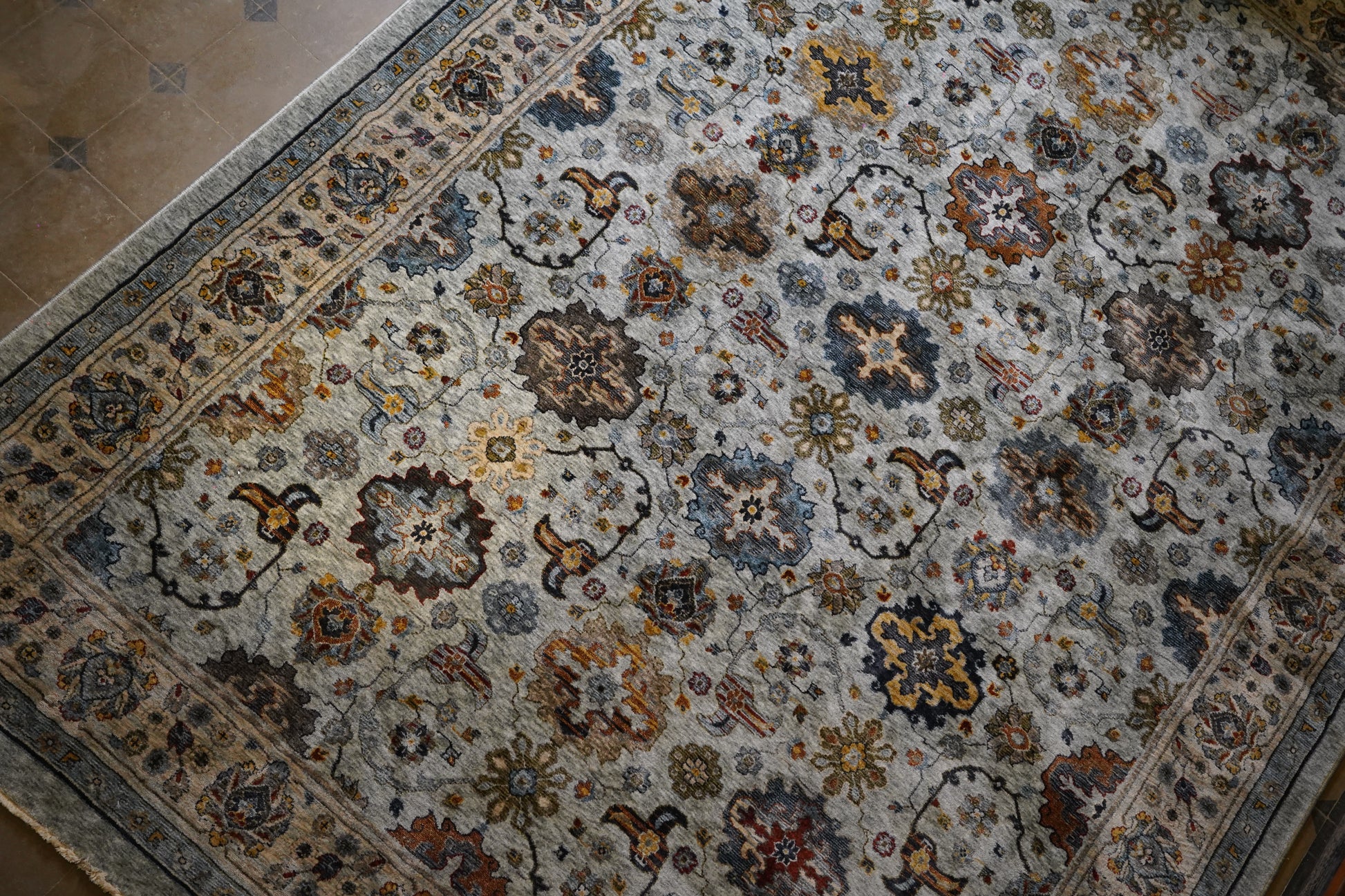 This piece is a serene interpretation of traditional Persian florals. The gentle blue field creates an airy backdrop for its faded floral motifs in amber, charcoal, and ivory tones. This rug offers a balanced blend of elegance and calm, making it ideal for modern homes, coastal palettes, and open, light-filled spaces.